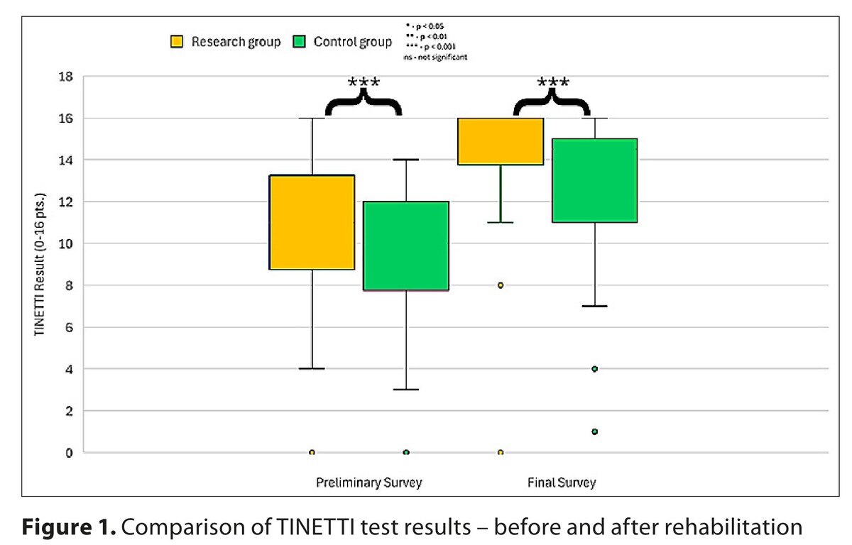 Significant improvements in TINETTI scores were observed in both groups (p < 0.001), indicating substantial functional improvement in balance. Motivation levels increased after rehabilitation in both groups. The motivation score increased from 3.23–3.77 in the control group and from 3.40–3.93 in the research group. However, no statistically significant differences between groups were observed. ADL results showed minimal variability, suggesting a ceiling effect and limited sensitivity of the scale for detecting functional changes.