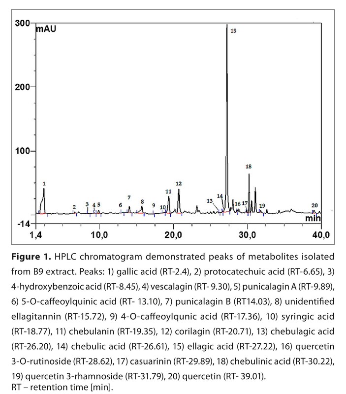 The phenolic profile of the B9 extract was characterized using UHPLC-ESI-MS/MS and included ellagic acid, gallic acid, chebulanin, chebulic acid, corilagin, and quercetin. Antioxidant activity was assessed using the DPPH assay; the B9 preparation exhibited strong radical scavenging activity (EC50 = 4.13 µg/mL), nearly six times higher than butylated hydroxytoluene (BHT) and comparable to Trolox. Antioxidant effects were further evaluated by measuring protein carbonyl group levels in Enterococcus faecalis ATCC 29212. Cytocompatibility was assessed by measuring the metabolic activity of normal intestinal epithelial cells (CCD 841 CoTr) using the MTT assay.