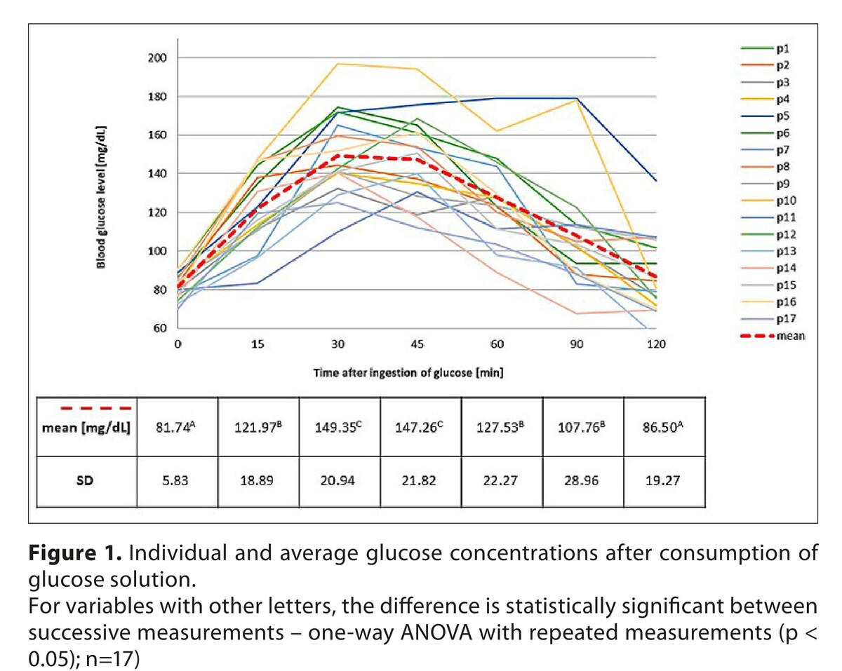 Fasting glucose levels were normal in all participants (average 81.74 ± 5.83 mg/dL). The incremental area under the glucose response curve (IAUC) after consumption of oatmeal with milk addition, was significantly lower than that after consumption of oatmeal prepared with water. The calculated GI of oatmeal prepared with water was significantly higher than the GI of oatmeal prepared with milk (58.4 vs. 44.5). According to the GI classification, oatmeal prepared with milk can be considered as a low GI product.