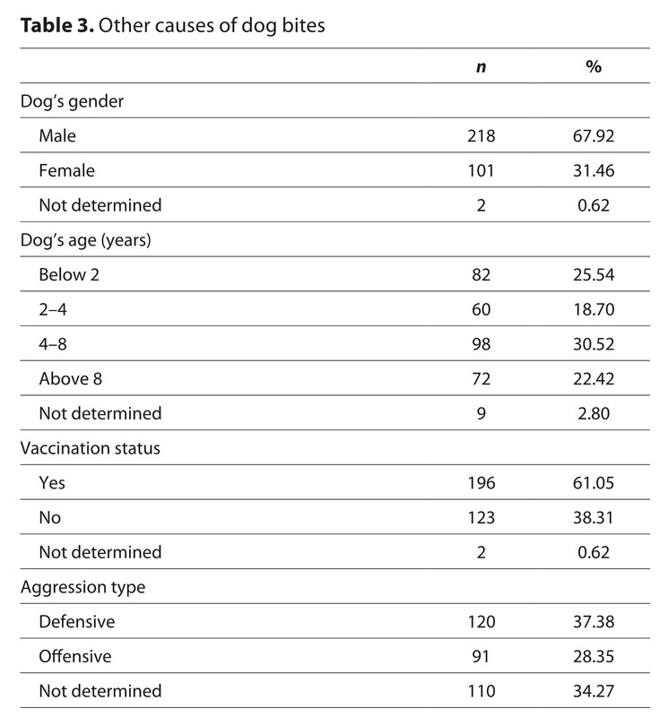 A total of 321 cases were studied, including breed, age, gender, and vaccination status of the dog, as well as the age of the victims and their relationship with the dog. In addition, aggression type, incident location and circumstances were taken into account.