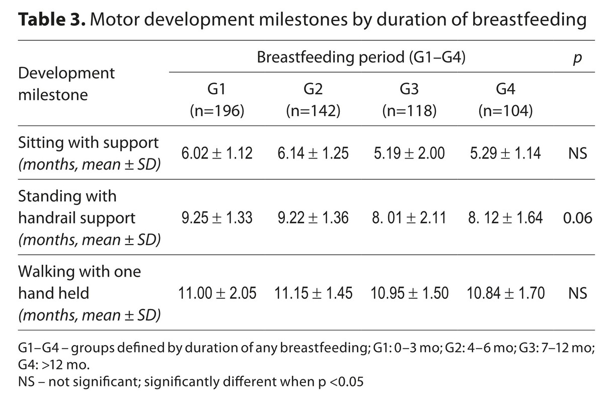 The study included 560 mother-child pairs from a family medicine clinic. Eligible children were aged 6–7 years, born after an uncomplicated perinatal course. Data were collected through maternal questionnaires, interviews, and chart reviews. Children were grouped by breastfeeding duration: G1 (0–3 months), G2 (4–6 months), G3 (7–12 months), G4 (>12 months). Outcomes included infection rates, motor milestones, and chronic disease prevalence.