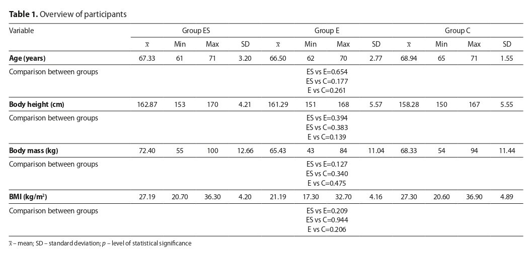 groups: ES – undergoing the authors’ original exercise programme with vibrating exercise equipment, E – subjected to the authors’ exercise programme without any equipment, and group C – no intervention. For evaluation of selected indicators, the following were used: baropodometric platform (foot load), Single Leg Stance test (balance and risk of falls) and the Biosway platform (balance and risk of falls).