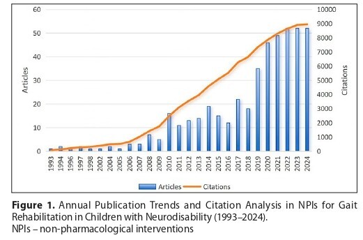 children with neurodisabilities. Non-pharmacological interventions (NPIs) have demonstrated positive outcomes in gait rehabilitation, although comprehensive analyses that map the global research landscape in this domain are limited. The aim of the bibliometric review is to systematically explore and visualize global research trends, identify hotspots, and highlight emerging themes related to NPIs for gait rehabilitation in children with neurodisability. The literature coverage spans 1993–2024.