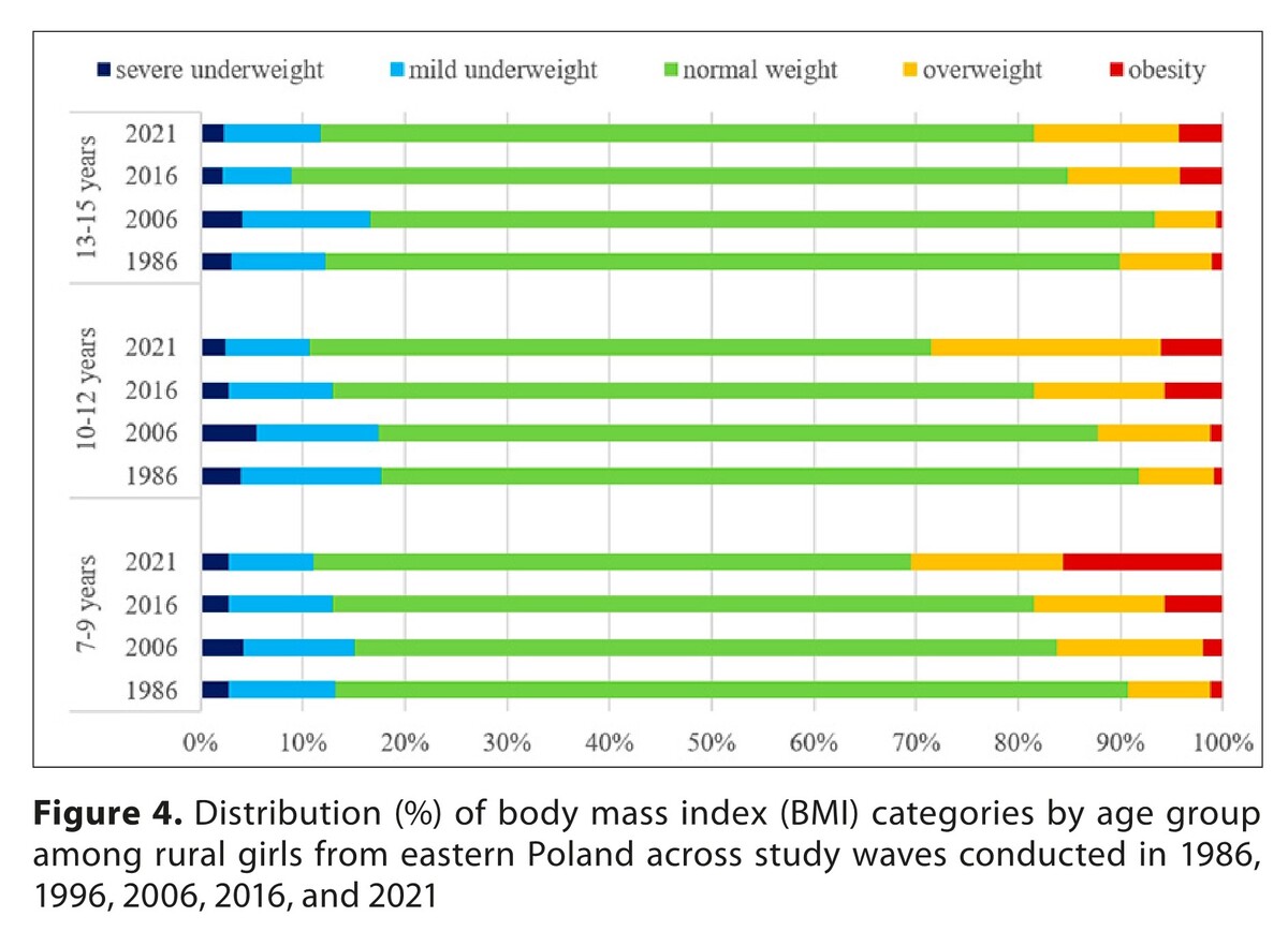 A systematic increase in body height and body weight was observed across all age groups. Between 1986 and 2021, mean body height increased by 7.66 cm and mean body weight by 7.03 kg, with the greatest dynamics occurring during the peripubertal period. Mean BMI increased by 1.37 kg/m2. A marked shift in BMI category distribution was observed, characterized by an increasing prevalence of overweight and obesity and a decline in the proportion of girls with normal body weight.