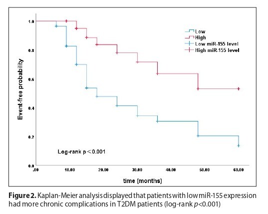 were measured using related instruments. The serum expression level of miR-155 in these three groups was detected through RT-qPCR. The early diagnostic value of miR-155 for T2DM was evaluated using a Receiver Operating Characteristic (ROC) curve. The predictive value of miR-155 for chronic complications in T2DM patients was assessed using a Kaplan-Meier curve. A logistic regression analysis was used to further assess the impact of miR-155 and other factors on T2DM complications.
