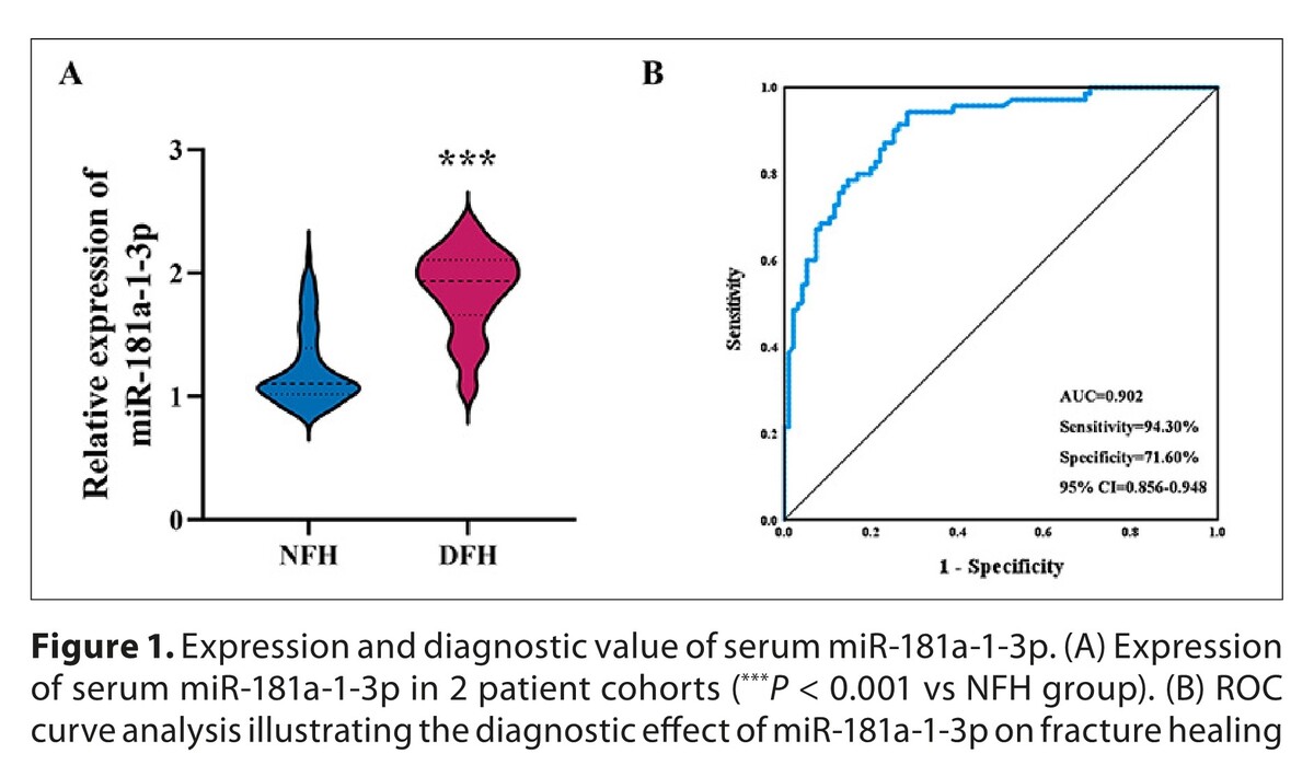 The study included 95 normal fracture healing (NFH) patients and 70 DFH patients. The expression of miR-181a-1-3p, DKK2, and osteogenic differentiation markers (RUNX2, OCN, OPN) was detected using RT-qPCR. The diagnostic utility of miR-181a-1-3p in DFH was evaluated through ROC curve. Cell proliferation was determined by CCK-8 assay. Detection of ALP activity was performed with an ELISA kit. Dual luciferase reporter assay and RIP assay were employed to validate the targeted binding of miR-181a-1-3p and DKK2.